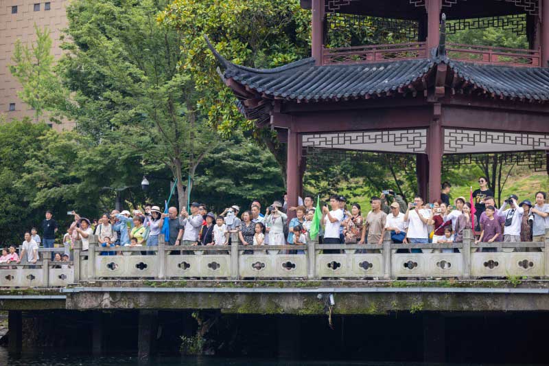 9支參賽隊伍分別登場亮相,龍舟健兒高喊著振奮人心的口號,吶喊聲響徹新安江畔。